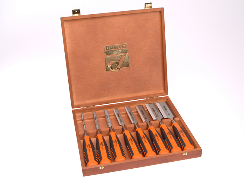 - The Bahco 424P-S8 Bevel Edge Chisel Set of 8 presented in a branded wooden presentation box.
